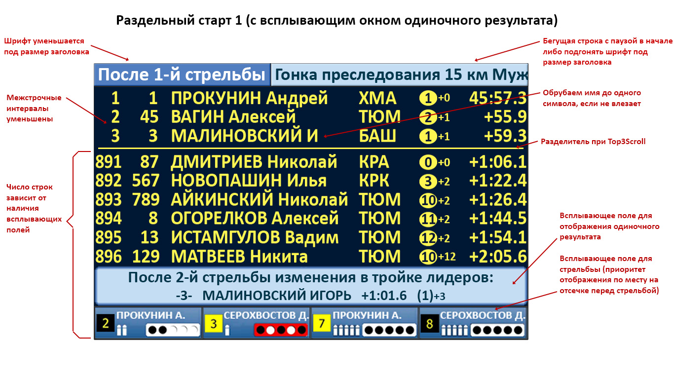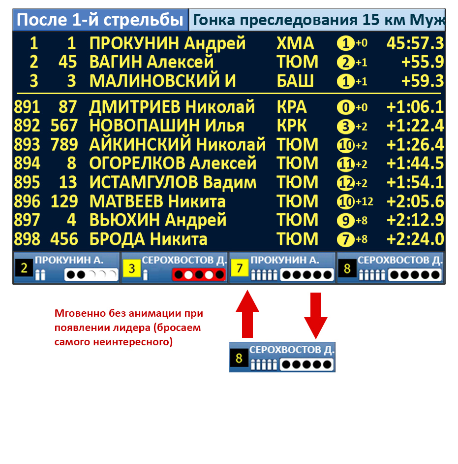 При появлении спортсменов на стрельбе внизу табло отображается графика стрельбы четырех из них с самым лучшим временем перед этой стрельбой.